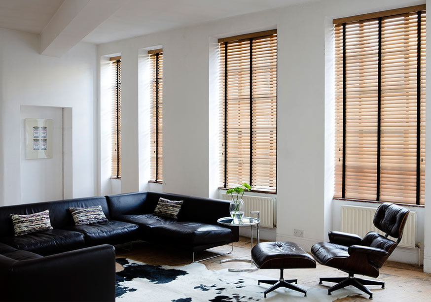 Wood venetian blinds offer a contemporary style statement and offer great control over privacy and light. Add the warm, inviting feel of richly stained or painted wood blinds into your home.